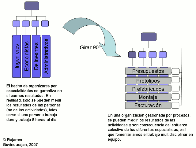 En una organización, la unidad funcional óptima de gestión no es un departamento, sino un proceso. Una organización “departamentalizada” se divide en líneas “verticales” (ver esquema) y así se nos “corta la visión del conjunto” y no nos permite ver la contribución de cada experto en el resultado final de la organización. Si uno desconoce la contribución de un recurso en el resultado final de la organización, no hay ni control ni optimización. Un proceso, en cambio, es una división “transversal” de la organización y nos permite: identificar y eliminar las actividades que no aportan valor; y asignar un responsable para su gestión pudiendo controlar así los presupuestos y resultados del producto.