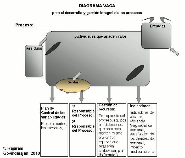Autor: : RajaramFecha: 2/07/11 0:30 19669 LecturasNo son gordas ni flacas: las vacas son lean. Os presento el Diagrama Vaca, una herramienta que he creado (1,2) para el desarrollo, control y mejora de los procesos (y sub-procesos). La palabra “proceso” sigue siendo complicada en entender. La falta de entendimiento de este concepto, por tanto también la falta de su implantación, impide a las organizaciones disfrutar de los enormes beneficios que aporta la gestión por procesos.